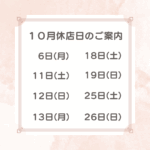 11月休店日は下記の通りとなります。 3日(日) 4日(月) 9日(土) 10日(日) 16日(土) 17日(日) 23日(土) 24日(日) 皆様には大変ご迷惑をお掛け致しますが、何卒ご理解 […]